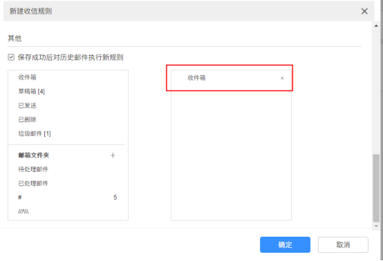 3.還可以對其他文件夾的歷史郵件執(zhí)行該收信規(guī)則。選擇需要執(zhí)行規(guī)則的文件夾范圍,下圖是選擇在收信箱執(zhí)行該規(guī)則。歷史郵件執(zhí)行規(guī)則只執(zhí)行一次。
