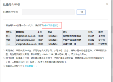 注意:1.模板表格中姓名,密碼和郵箱地址為必填項(xiàng),其它單元格可以留空,但不可以刪除或修改表頭。