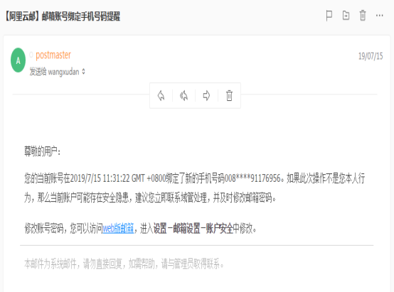 3.【阿里云郵】郵箱賬號(hào)綁定手機(jī)號(hào)碼提醒_